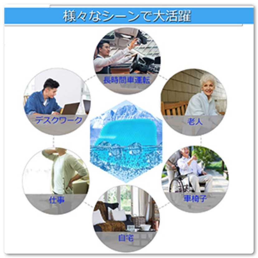 長時間のテレワーク、運転、釣りなどの座っている時間が長いレジャーなど様々なシーンで活躍します。普通のクッションと異なりゲル材質のため適度に反発があり気持ちのいい弾力性があります。柔らかくて弾力のあるゲル素材なので、柔軟性に優れており、すぐ元の形に戻ります。長期間使っても変形しないので、普通のクッションより耐久性に優れています。