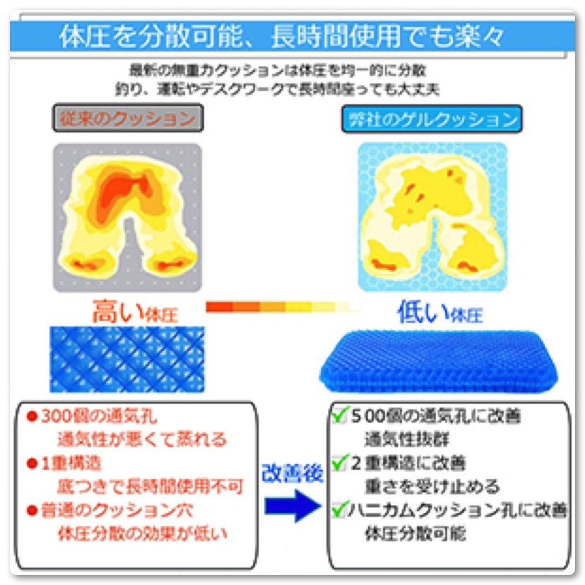 従来の400個の穴から500個のハニカムクにアップグレードしましたので、このジェルクッションは通気性がよく長時間座っていても蒸れずに快適に過ごせます。
