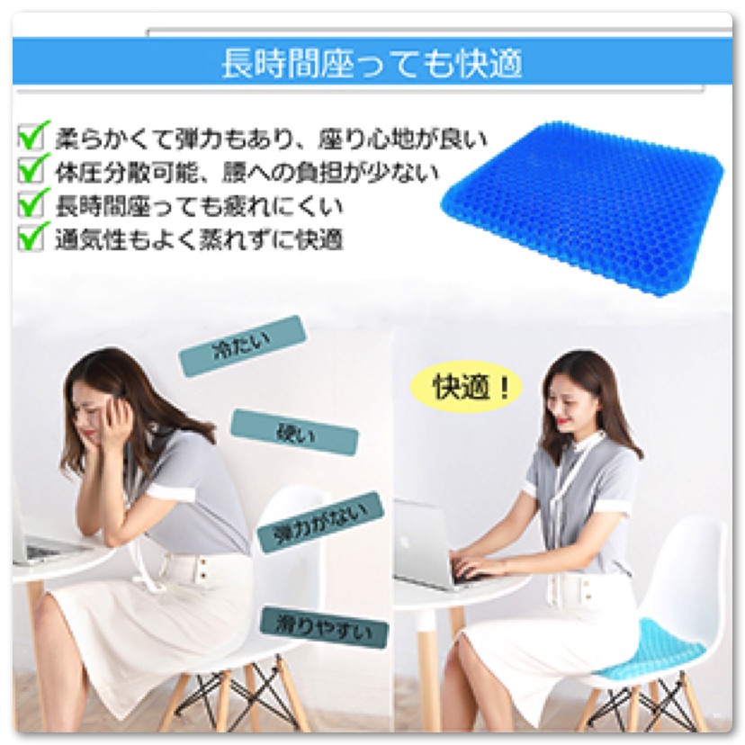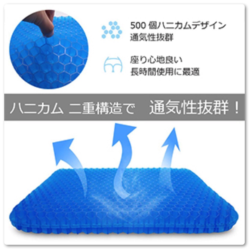 最近、Amazonをはじめネットショップで大流行しているハニカムゲルクッション。通気性抜群のハニカム構造のクッションで体圧が分散され長時間座っていてもお尻が痛くならないとのこと。